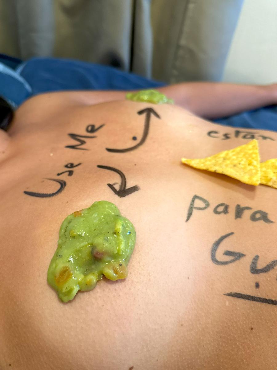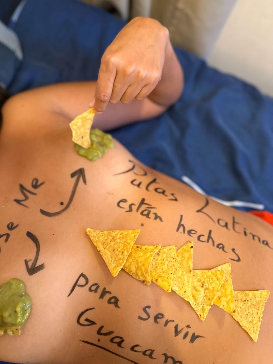 Ci sono guacamole, tortillas e una prostituta latina per i drink! 🍹 Aiutati! 😊😋🩷🩷🩷 Sai che mi piace giocare con il cibo 😊 Eppure mia mamma mi diceva sempre “non giochiamo con il cibo”, quando in realtà faceva lo stesso! 😜❤️🔥❤️🔥 Quindi, è l’occasione per fare un po’ di body writing in spagnolo 🌞